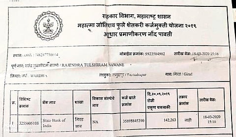 बॅंकेतून कुठलेही कर्ज न उचलता राजेंद्र बावणे यांच्यावर पीककर्ज लादल्या गेले. हे कर्ज महात्मा ज्योतिबा फुले शेतकरी कर्जमुक्ती योजनेतून 18 मार्च 2020 रोजी आधार प्रमाणीकरण नोंद करून माफ करण्यात आले. कर्जमुक्ती योजनेतून आधार प्रमाणीकरण नोंद पावती 3255005108 क्रमांकानुसार कर्ज खाते क्रमांक 35898845390 आहे. 30 सप्टेंबर 2019 रोजी राजेंद्र बावणे यांच्याकडे एक लाख 42 हजार 263 रुपये एकूण कर्जाची थकबाकी असल्याचे दर्शविले होते.