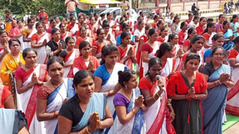 चंद्रपूर : वैद्यकीय महाविद्यालय व रुग्णालयातील कंत्राटी कामगारांचे जिल्हाधिकारी कार्यालयासमोर आंदोलन सुरू आहे. आंदोलनकर्त्या महिलांनी रविवारी (ता. 8) जागतिक महिला दिनाचे औचित्य साधून मुख्यमंत्री व उपमुख्यमंत्री यांच्या प्रतिमेसमोर प्रार्थना केली. कंत्राटी कामगारांना किमान वेतन, नियमित पगार आणि चांगली वागणूक मिळावी, अशी मागणी केली.