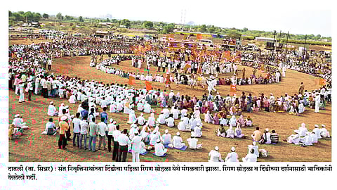 दातली येथील पहिल्या गोल रिंगण सोहळ्यासाठी तळवाडे (ता. त्र्यंबकेश्वर) येथील पांडुरंग बोडके यांचा देवाचा अश्व व पिंपळद येथील मनोहर घोलप यांचा स्वाराचा अश्व रिंगणस्थळी आणण्यात आला. संस्थानचे अध्यक्ष संजयनाना धोंडगे, सचिव पवनकुमार भुतडा, पालखी सोहळा अध्यक्ष पंडित महाराज कोल्हे, व्यवस्थापक पुंडलिकराव थेटे, विश्वस्त रामभाऊ मुळाणे, जयंत महाराज गोसावी, त्र्यंबकराव गायकवाड आदींनी अश्वांची पूजा केली. सुरवातीला पताकाधारी वारकऱ्याने एक प्रदक्षिणा पूर्ण केली. त्यानंतर ‘पुंडलिक वरदा हरी विठ्ठल’ नामाचा जयघोष करीत देवाचा व स्वाराचा अश्व रिंगणात सोडण्यात आले. या दोन्ही अश्वांनी नेत्रदीपक तीन प्रदक्षिणा पूर्ण करून लाखो भाविकांच्या डोळ्यांचे पारणे फेडले. रिंगण पूर्ण होताच अश्वांच्या टापाखालील माती भाळी लावण्यासाठी भाविकांनी गर्दी केली.