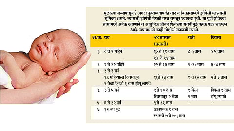 मुलांच्या जन्मापासून ते अगदी कुमारवयापर्यंत वाढ व विकासामध्ये झोपेची महत्त्वाची भूमिका असते. त्यासाठी झोपेची नेमकी गरज समजून घ्यायला हवी. या पूर्ण झोपेच्या तासांमध्ये अनेक कारणाने व आधुनिक जीवन शैलीच्या सवयीमुळे फरक पडत चालला आहे. वयाप्रमाणे काही गोष्टींची काळजी घ्यावी.